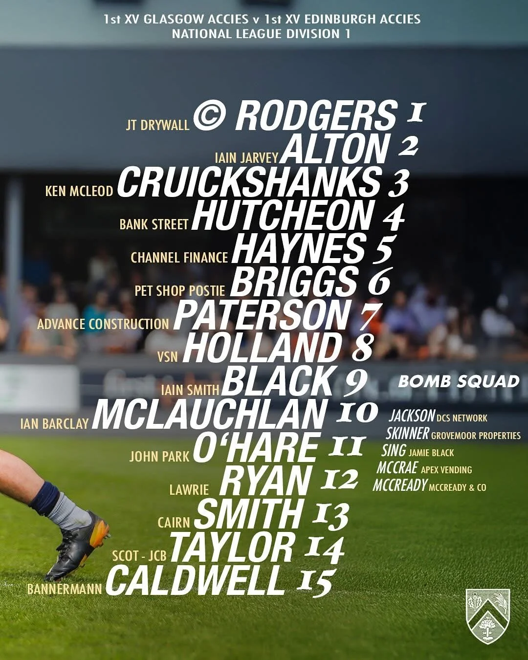 Here’s our starting XV as we take on Edinburgh Accies at 15:00. With lunch beforehand and a dry forecast, we’re looking forward to a great afternoon of rugby!